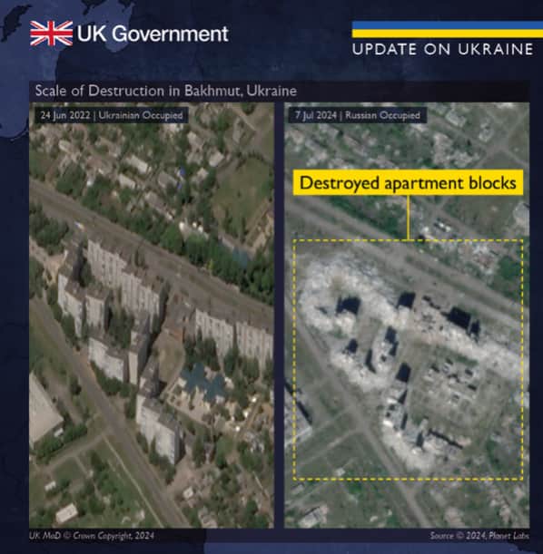 The UK Ministry of Defence has posted satellite images of some of the buildings in Ukraine's city of Bakhmut destroyed by Russia.