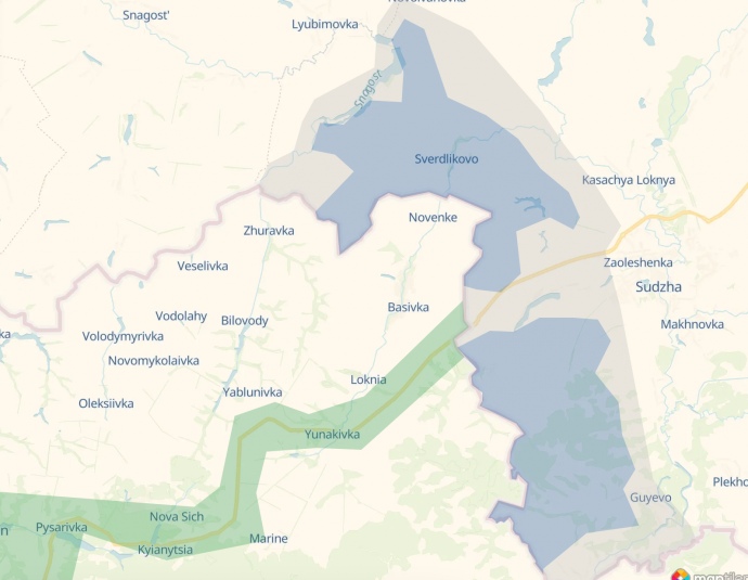 The territories infiltrated by Ukrainian troops are marked in grey on the map. Around them, in a darkened zone there are territories with an uncertain status which requires clarification. Map: DeepState
