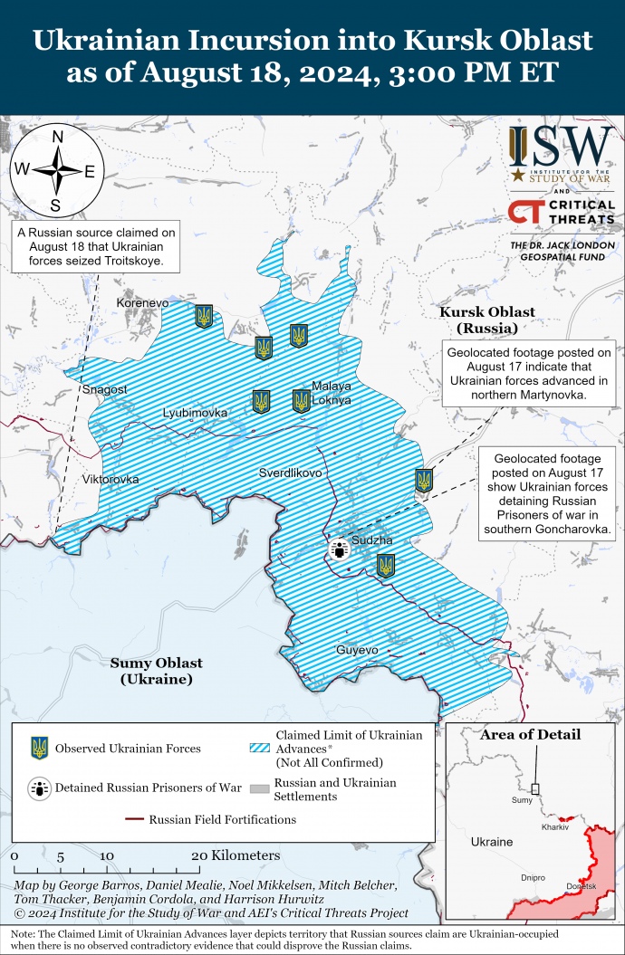 A Russian military blogger claimed on 18 August that Ukrainian forces had captured Troitskoe (south of Korenevo and about two kilometres from the border) and advanced to Semenovka (north of Sudzha and about 24 kilometres from the border).