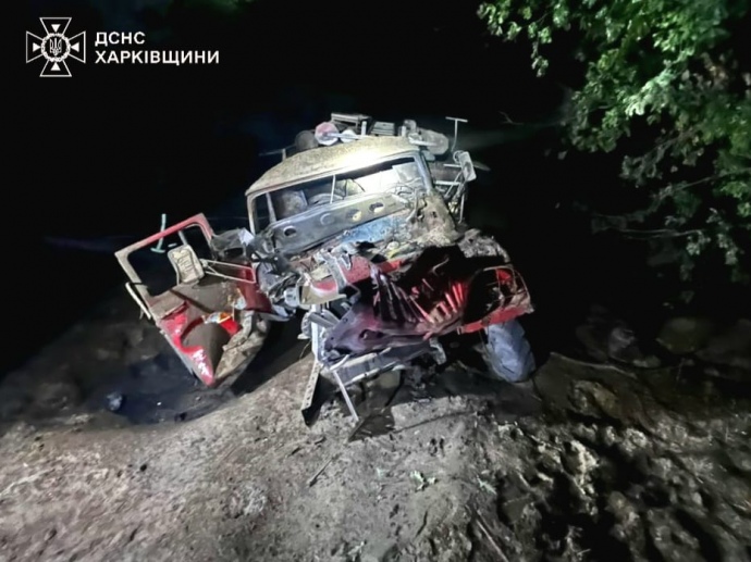 Three firefighters from Kharkiv Oblast have been injured in Donetsk Oblast when their fire engine hit an explosive device and was blown up.