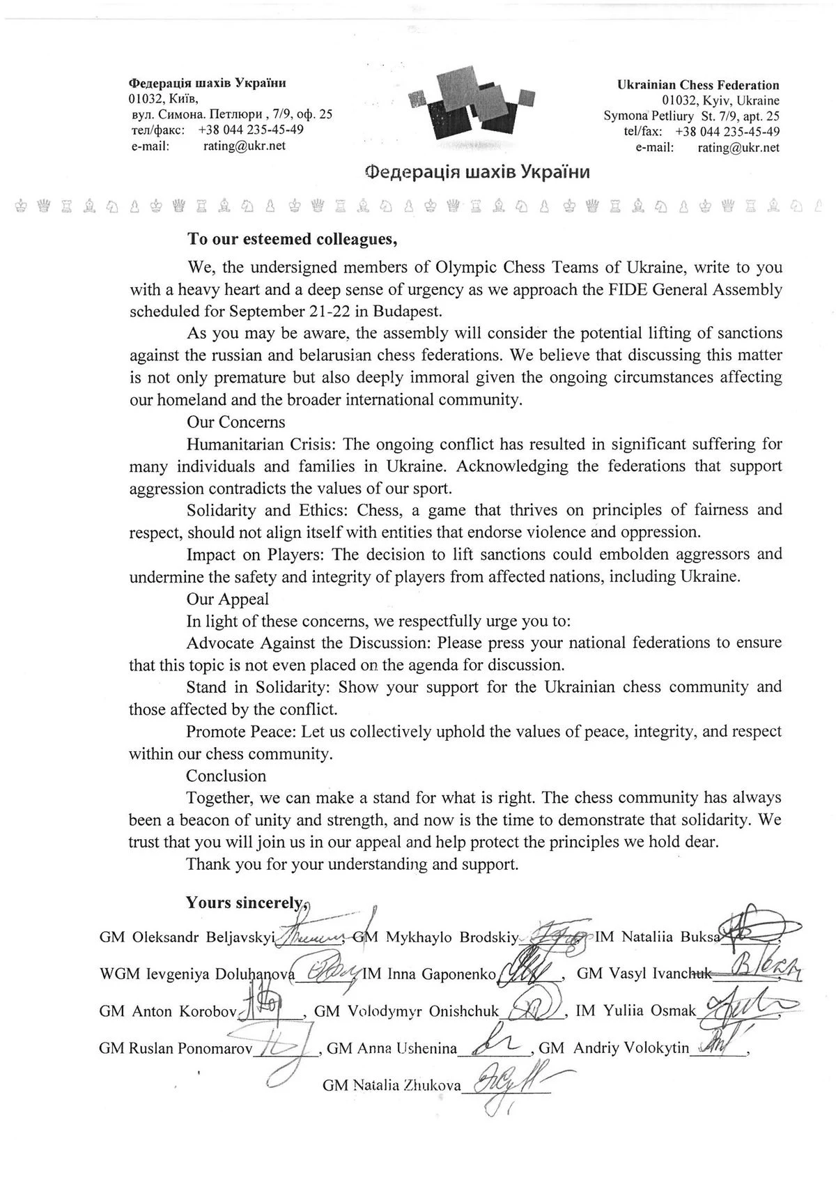 We respectfully urge you to press your national federations to ensure that this topic is not even placed on the agenda for discussion. Show your support for the Ukrainian chess community and those affected by the conflict. Let us collectively uphold the values of peace, integrity, and respect within our chess community."