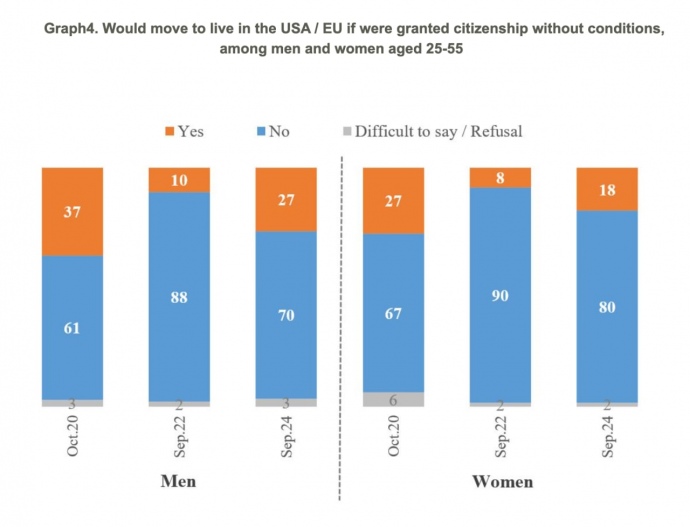70% of men do not wish to leave Ukraine, with only 27% wanting to emigrate. Among women, 80% would not leave the country, and 18% would be willing to move.