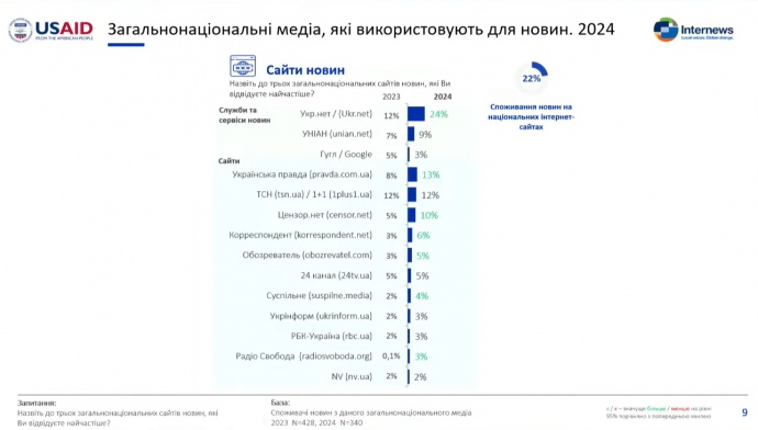 Details: Ukrainska Pravda is the top-ranked news site, with 8% of respondents reading it in 2023 and 13% in 2024.
