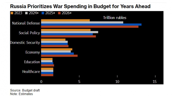 Bloomberg's calculations are based on the draft budget, and Russia plans to slightly reduce military spending in the next two years: to 5.6% of GDP in 2026 and to 5.1% of GDP in 2027.