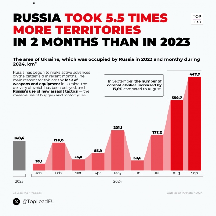 Details: According to the analysts, in the first half of 2024, Russia managed to seize at most 200 square kilometres per month, in August it was 351, and in September – 468 square kilometres.