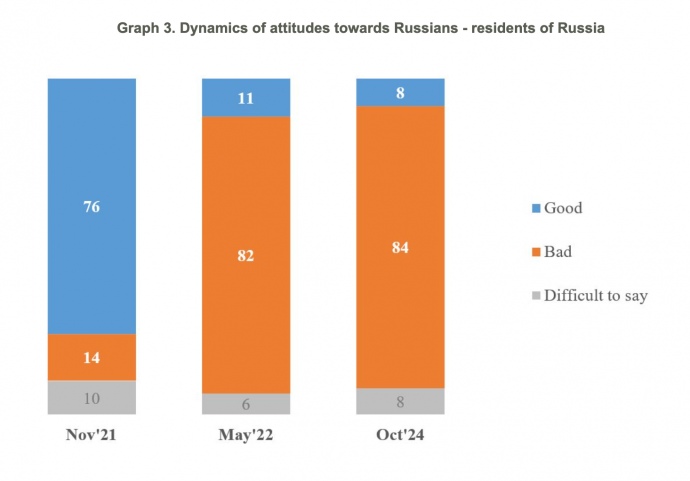 Sociologists also inquired about Ukrainians' views towards Russians – residents of Russia – and found that currently, only 8% of Ukrainians have a positive view of Russians, while 84% hold a negative view.