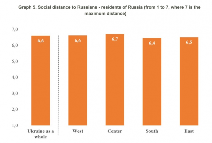 In addition, some Ukrainians were asked how close a relationship they are willing to allow with Russians (using the Bogardus scale, where 1 means they would accept them as a family member, and 7 means they would not let them into Ukraine). The overwhelming majority responded that residents of Russia should not be allowed into Ukraine at all.