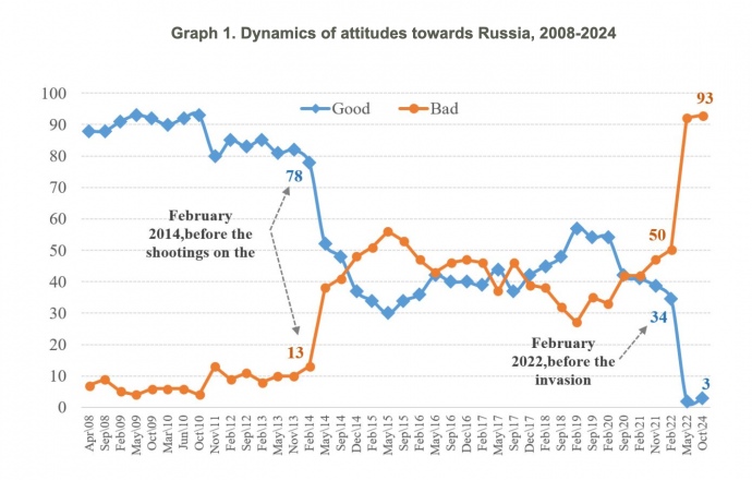 Quote: "Russian authorities and propaganda claim that their aggressive actions are a response to rising anti-Russian moods (although even this cannot justify military action in any case). However, our data show that Ukrainians maintained a good attitude towards Russia, and only Russia, with its brutal measures, forced Ukrainians to reconsider their attitude," KIIS emphasises.