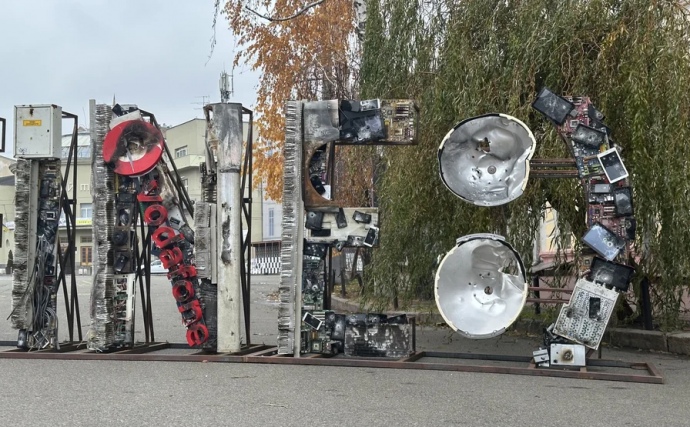 Details: The letters forming I’m Fine were created using actual components from base stations and network equipment damaged during shelling and Russian occupation. The structure incorporates bullet-riddled antennas, mangled masts, severed wires and microchips shattered by explosions.