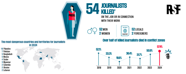 An annual report by the Reporters Without Borders organisation on press freedom says that 54 journalists have been killed worldwide in 2024.