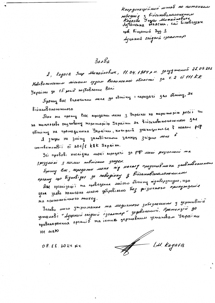 Details: In October 2024, Kadayev was sentenced to 15 years in prison. In November, he sent a letter to the Coordination Headquarters for the Treatment of Prisoners of War, asking to be transferred to Russia or Russian-occupied territories.