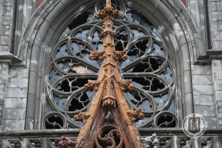 Quote: "The rose window has been damaged, that is, the largest flower in the centre [meaning the large circular window above the entrance, a traditional feature of Gothic churches]. No plasterwork was harmed, only the stained-glass windows were shattered. The windows in the towers were also smashed," Father Pavlo said.