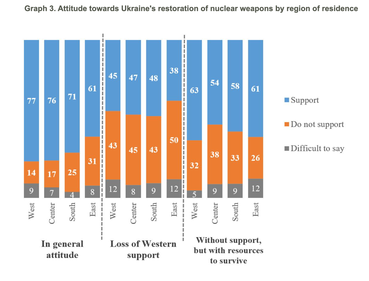 In all oblasts of Ukraine, the majority – ranging from 61% in the east to 77% in the west – generally support restoring nuclear weapons.