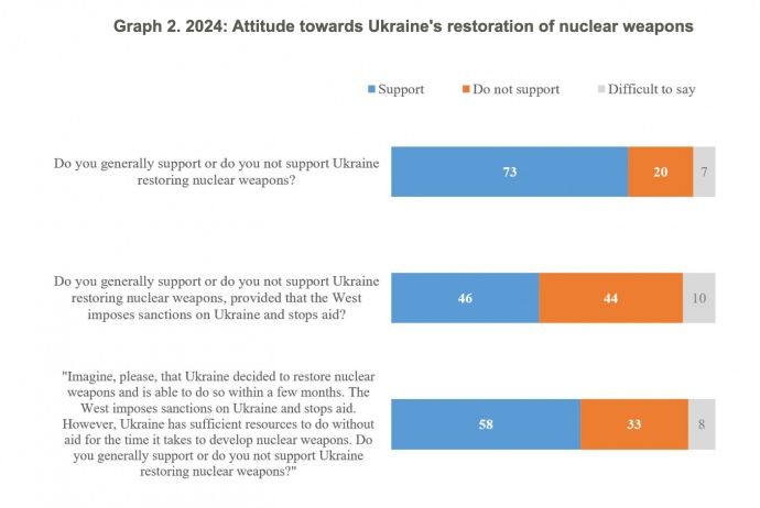 Quote from KIIS: "If the scenario involves losing Western support and facing sanctions, support for restoring nuclear weapons drops to 46%, while 44% would oppose such an initiative, with 10% undecided."
