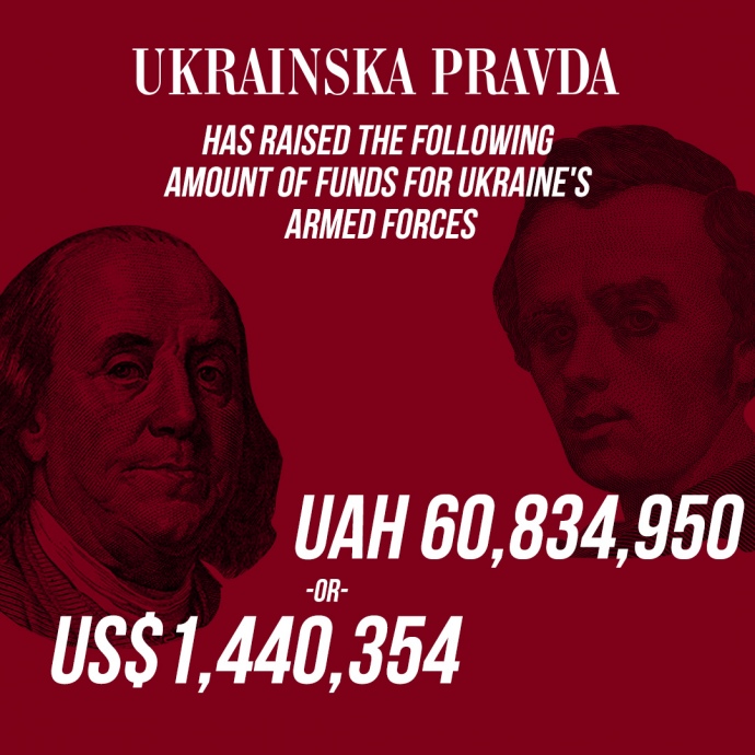 Details: The majority of the funds came from donations by Ukrainska Pravda readers and viewers. Contributions from large businesses amounted to US$149,431, while top managers from CEO Club contributed US$11,163. The Ukrainska Pravda editorial team directly donated US$15,481 from ticket sales for its own events. An auction marking the outlet’s anniversary raised an additional US$52,953.
