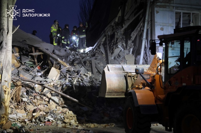 Search and rescue operations continue at the site of a Russian missile strike on the city of Zaporizhzhia. The body of a man has been retrieved from under the rubble. Another person is still trapped under the collapsed building.