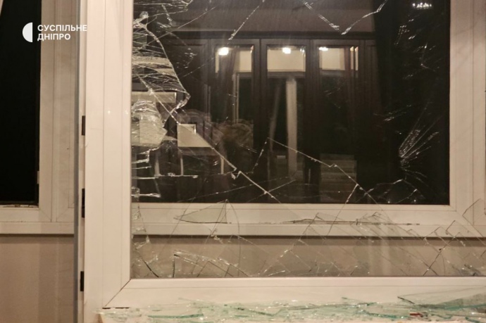 Quote from Suspilne Dnipro: "Windows and doors were damaged on the upper floors of the building, and cars were damaged by wreckage and a blast wave near the site of the hit."