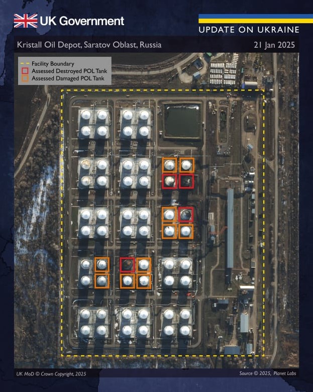 An analysis of images from 21 January 2025 shows that four fuel tanks were destroyed and another ten were damaged.