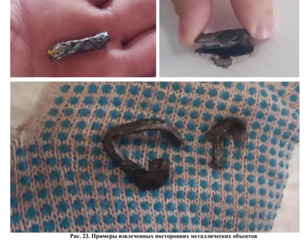 The document includes photographs of foreign objects, including metal fragments, found embedded in the wreckage.
