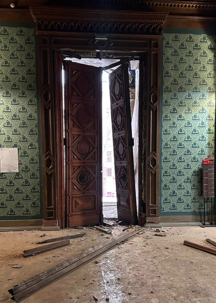 The National Odesa Philharmonic Orchestra has posted pictures of the damaged premises. The photos show smashed glass and the damaged door of the main entrance to the building.