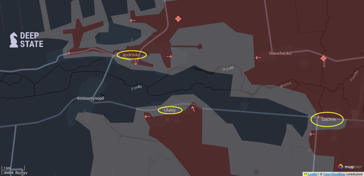 Quote from DeepState: "The enemy has advanced near the villages of Ulakly, Burlatske and Andriivka."