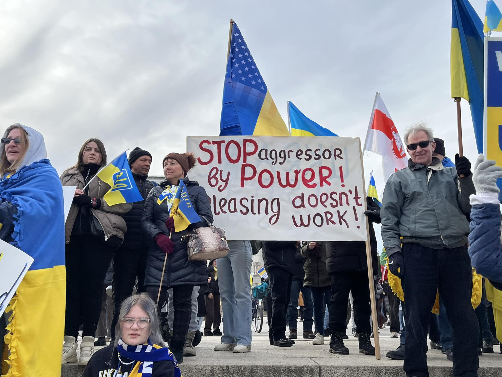 Details: Yarysh stated that the demonstrators are holding posters stating "Ukraine is not for sale", "Nothing about Ukraine without Ukraine", and "Stop the aggressor by force!"