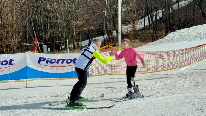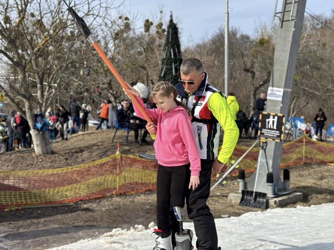 Eight-year-old Marynа Ponomariova from Kherson Oblast has become the first girl wearing an above-knee prosthesis to ski down a slope with a coach, setting a national record.