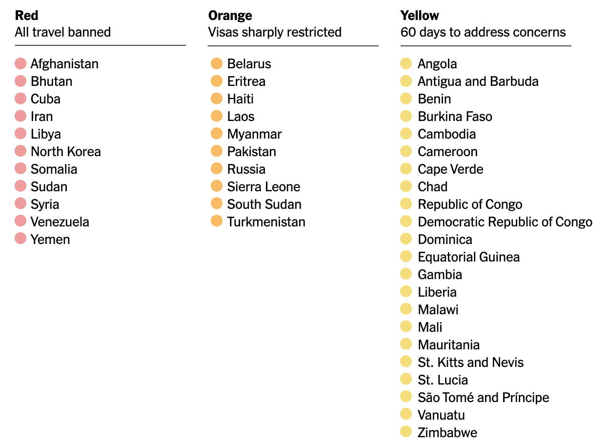 The "red" list consists of 11 countries whose citizens will be completely banned from entering the US.