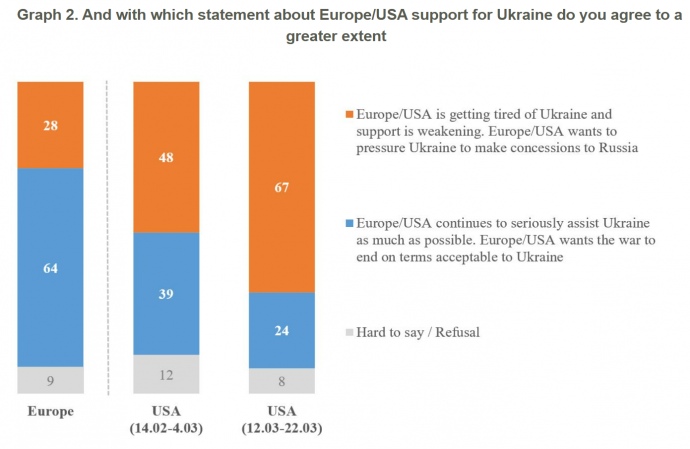 Quote from KIIS: "As can be seen in the graph below, we have a practically ‘mirror’ perception of Europe and the USA. In the case of Europe, 64% consider it an ally of Ukraine that wants peace on acceptable terms, while 28% do not. In the case of the USA, according to the latest data, 67% believe that they are tired of Ukraine and are pressuring for concessions. Only 24% believe that the USA is an ally that wants an acceptable peace."