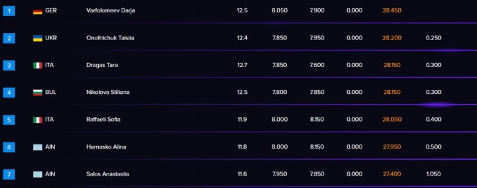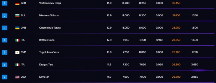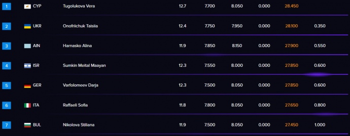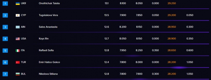 Onofriichuk received 29.250 points from the judges, edging out former Russian athlete Vera Tugolukova, who now competes for Cyprus, by just 0.050 points.