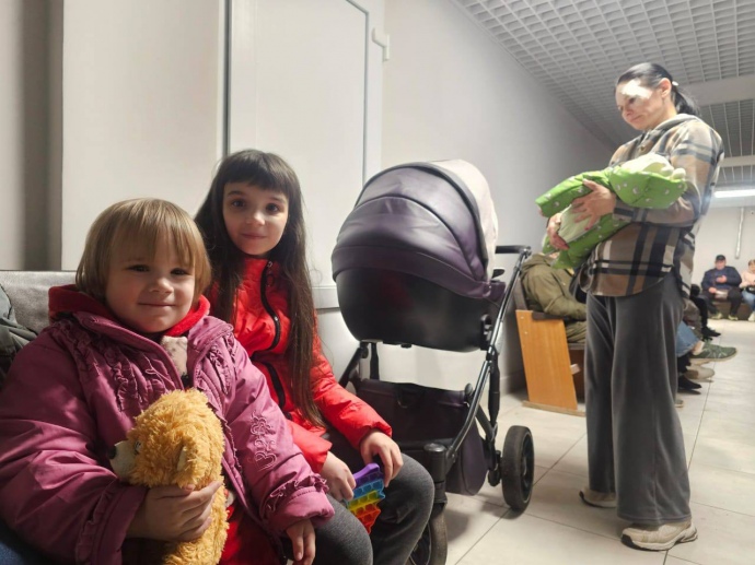 The family is now taking shelter in a hospital close to their home. Her older daughters, nine-year-old Mariia and four-year-old Viktoriia, doze on wooden benches as their mother rocks her youngest child.