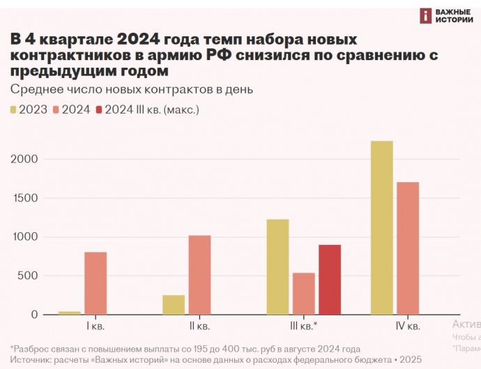 Details: Vazhnye Istorii notes that the recruitment rate has slowed down compared to the previous year. In particular, an average of 1,700 people signed contracts per day in the 4th quarter of 2024, which is 1.3 times less than in the same period in 2023.