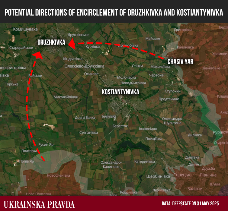 Quote from Hlib Voloskyi, analyst at the Come Back Alive Initiatives Centre: "If the Russians can reach Druzhkivka, they will do so. If not, they will at least try to establish fire control over the roads to Kostiantynivka, from Pokrovsk on one side and Kramatorsk on the other. One of the problems is that Kostiantynivka is located in a lowland area that lies around the heights of Chasiv Yar and Toretsk. If they take control of these heights, it will be very easy for them to establish fire control over both the city and the logistics routes."