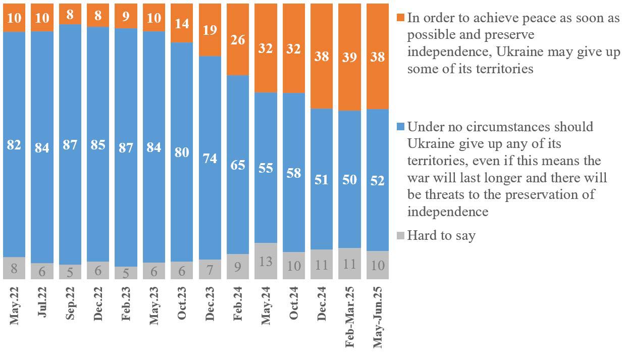 For reference: The survey was conducted by KIIS from 15 May to 3 June 2025, during which it independently added questions about readiness for territorial concessions and conducted an experiment to assess how different interpretations of "territorial concessions" affect responses.