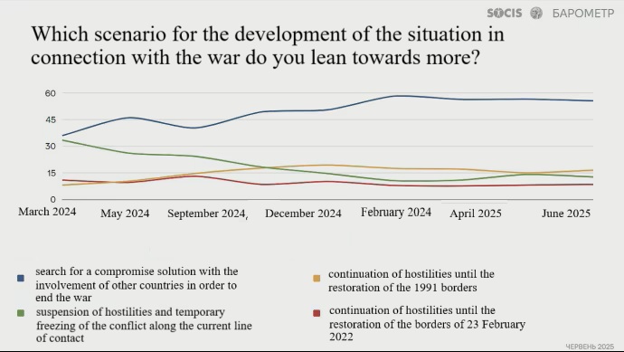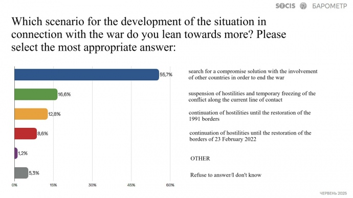 Details: According to the survey, 55.7% of Ukrainians are in favour of finding a solution through compromise to end the war, while 16.6% agree to a suspension of hostilities and a temporary ceasefire along the current line of contact.