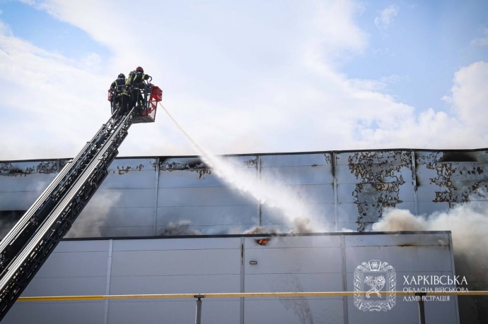 The attack hit a distribution centre comprising three businesses, including a supermarket. A large fire broke out."