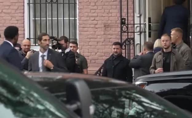 Zelenskyy was wearing a black shirt and a black jacket as he met European leaders outside the Ukrainian Embassy in Washington on Monday.