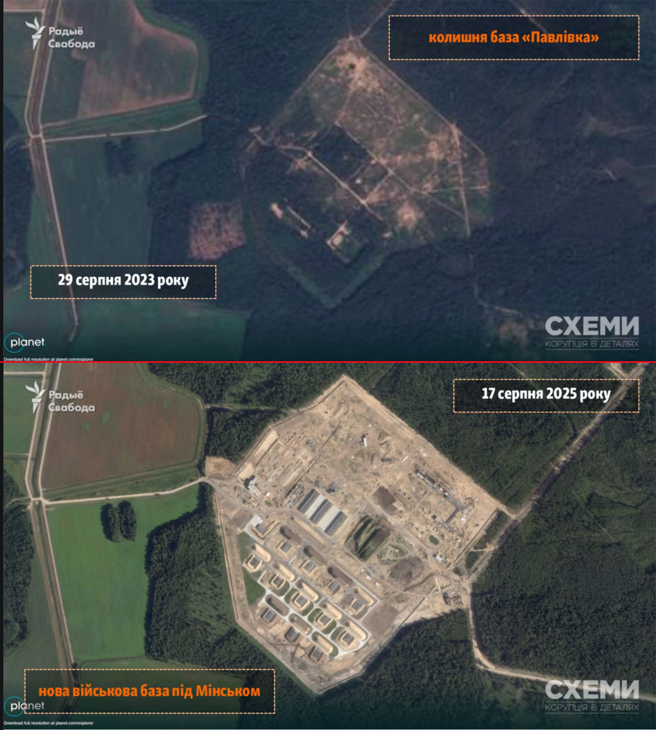 The first base is being built near the village of Pavlovka, south of Minsk. Construction began in June 2024, and as of September 2025, the construction site covers over 2 sq km. The experts believe that Russian Oreshnik ballistic missile systems may be deployed there.