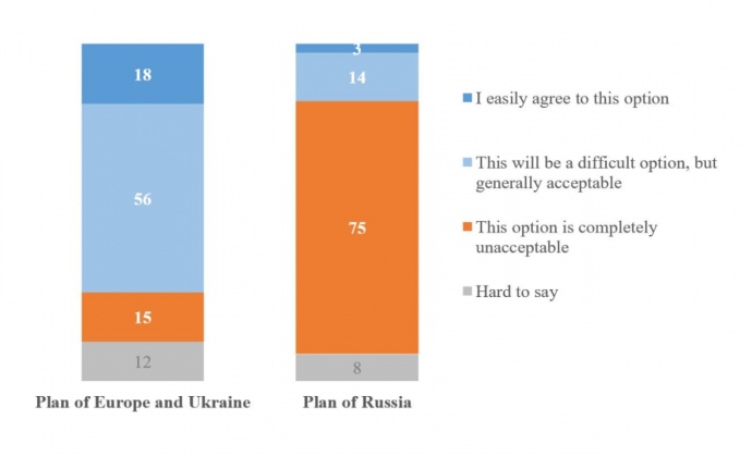 At the same time, 74% of Ukrainians (mostly without enthusiasm) are willing to support the European and Ukrainian plan. Only 15% categorically reject it.