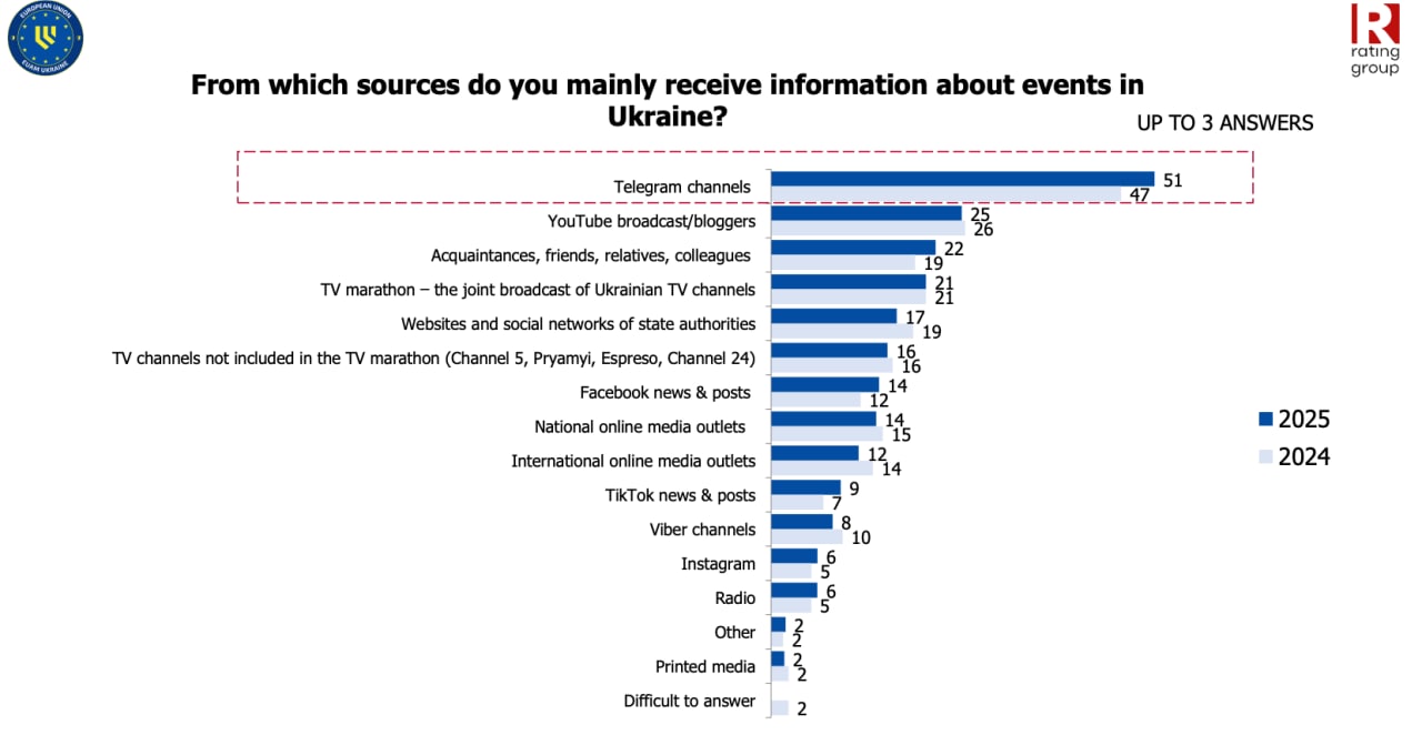 Details: According to the survey, 51% of Ukrainians continue to rely on Telegram as their primary news source. YouTube ranks second (25%) with bloggers’ streams and videos, and 22% cite their personal networks, such as friends, relatives or colleagues.