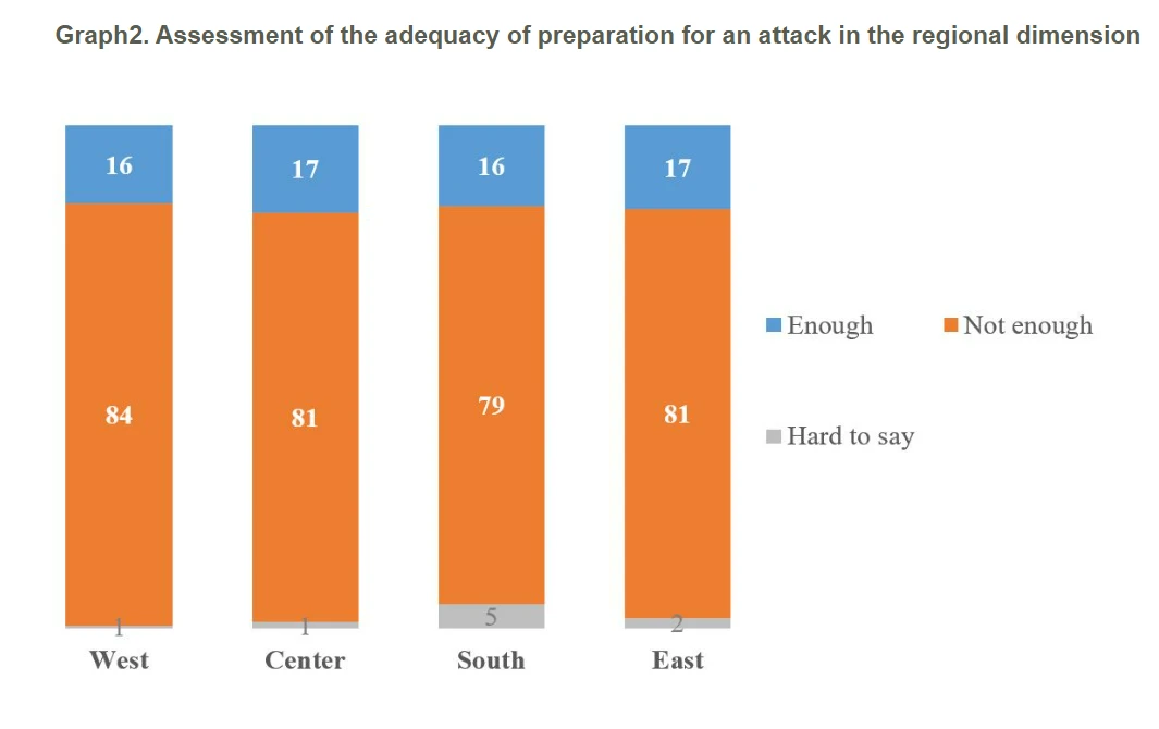Meanwhile, 16% believe Ukraine did nearly or completely enough to prepare: of these, 14% think it mostly did enough despite some miscalculations, and 2% believe Ukraine fully met all preparation requirements.