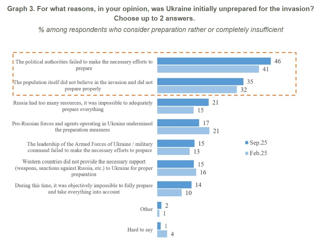 The results show no clear consensus among the population on the causes of insufficient preparedness. The most common response was that the political leadership failed to take the necessary action (46% of those who felt Ukraine was unprepared, up from 41% in February 2025).