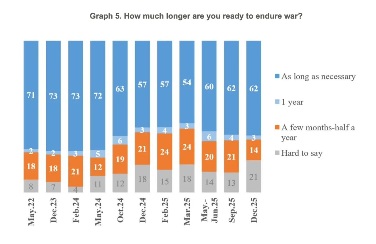 Nevertheless, the majority of Ukrainians – 62% – continue to say they are ready to endure the war for as long as necessary. Another 3% said they would be prepared to endure it for about a year.