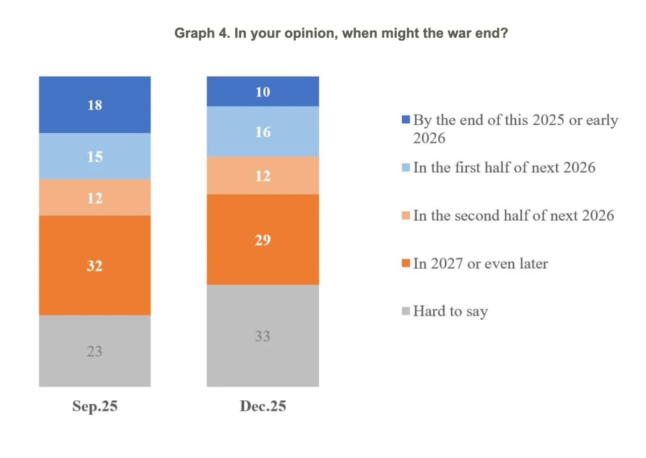Details: The survey shows that only 10% of Ukrainians expect the war to end before the start of 2026 (down from 18% in September), while just 16% believe it could end at least by the first half of 2026 (15% in September).