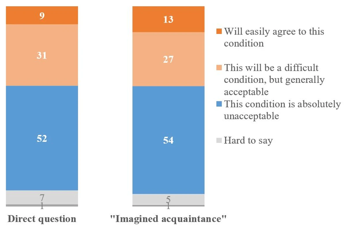 Among Kyiv residents, 59% consider giving up Donbas totally unacceptable, while 31% are ready to accept it. In the west of the country, 57% totally reject it and 38% are ready to accept it; 49% and 42% in the centre and north; 49% and 44% in the south; and 50% and 39% in the east.
