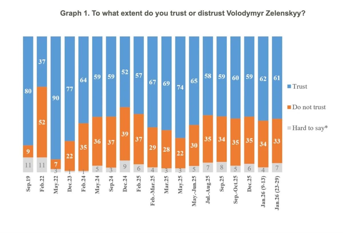 "So, currently, the majority of Ukrainians – 61% – continue to trust the President, 33% do not trust him. The balance of trust-distrust is +28%. In mid-January 2026, the indicators were almost identical," the sociologists said.