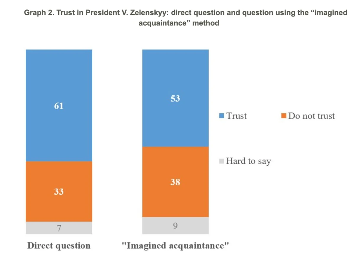Formally, under normal circumstances, the statistical error of such a sample (with a probability of 0.95 and taking into account the design effect of 1.3) did not exceed 4.1%. At the same time, an experiment was conducted for the question about trust in President Volodymyr Zelenskyy, where half of the respondents (i.e. about 500) were asked a regular direct question (to what extent the respondent trusts or does not trust him), and the other half were asked using the indirect "third-person" method (people were asked whether an acquaintance they had in mind trusted the president). Therefore, for this question, the error does not exceed 5.8%.