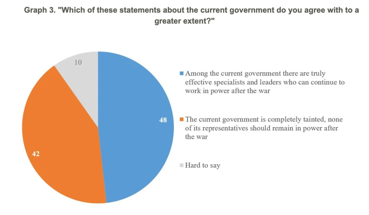 Quote: "As the survey results show, half of respondents (48%) believe that there are real professionals among the current government and that they can remain in power after the war. However, only slightly fewer (42%) consider the current government to be completely tainted and argue that none of its representatives should remain in power after the war."