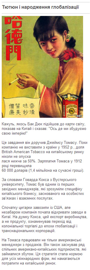 "Його цигарки виглядали однаково, – розповідає Ґудмен. – Піонером глобалізації, символом якої нині є "МакДональдс" чи "Старбакс", був Дюк зі своїми сигаретами".
