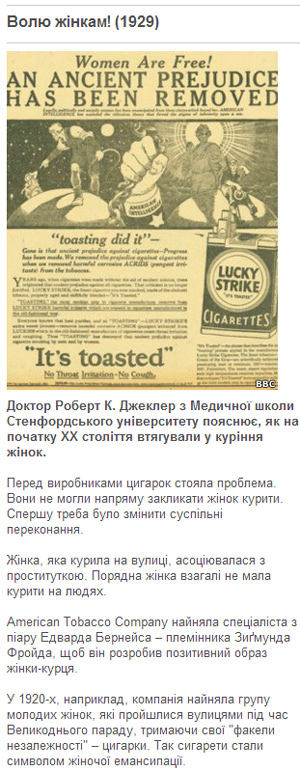 Ба більше: цигарки називали корисними для здоров’я. До 1906 р. вони вважалися лікарським засобом: їх виписували від кашлю, застуди та туберкульозу (хвороби, яку Всесвітня організація охорони здоров’я нині асоціює з тютюнопалінням).